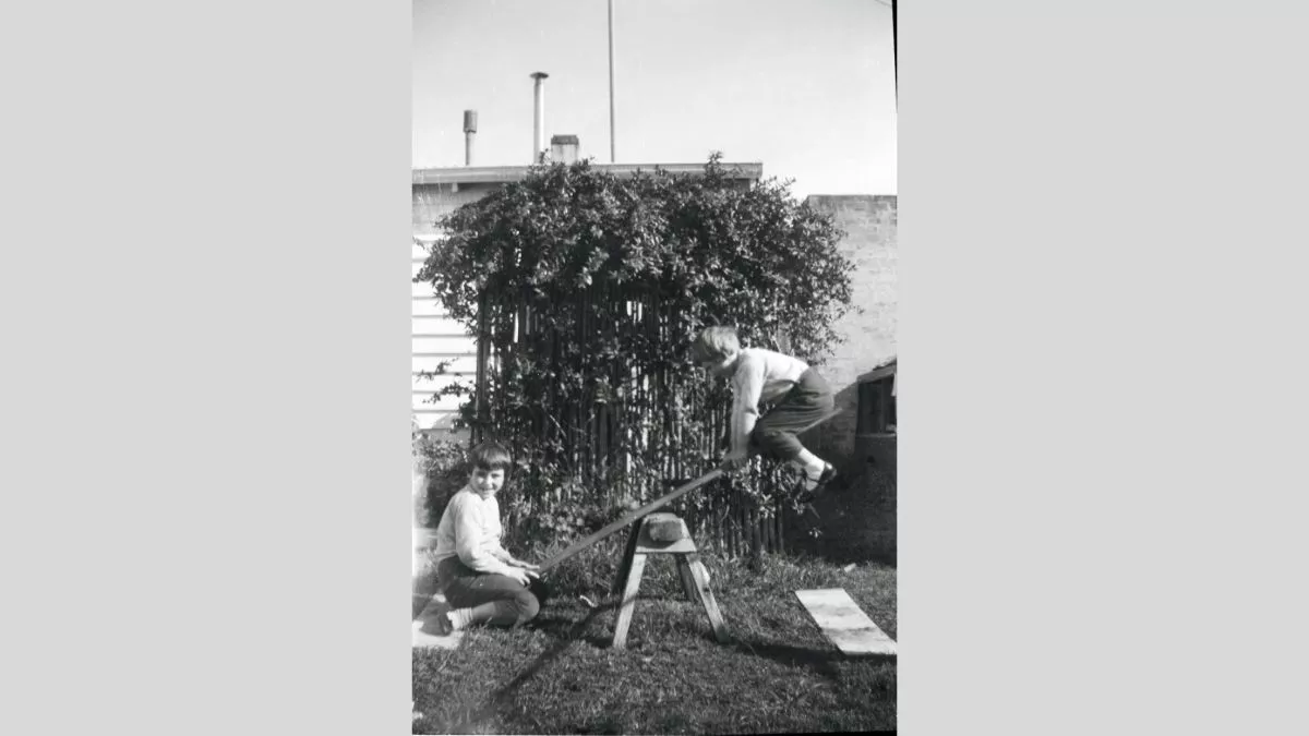 Entrant statement: Sisters, Susan and Pamela Johns, being creative by making a see-saw from what was found in their backyard in Gordon Street, Balwyn. Susan is on the left and is sitting on the plank balanced on the saw horse. Many hours of fun were had by all.