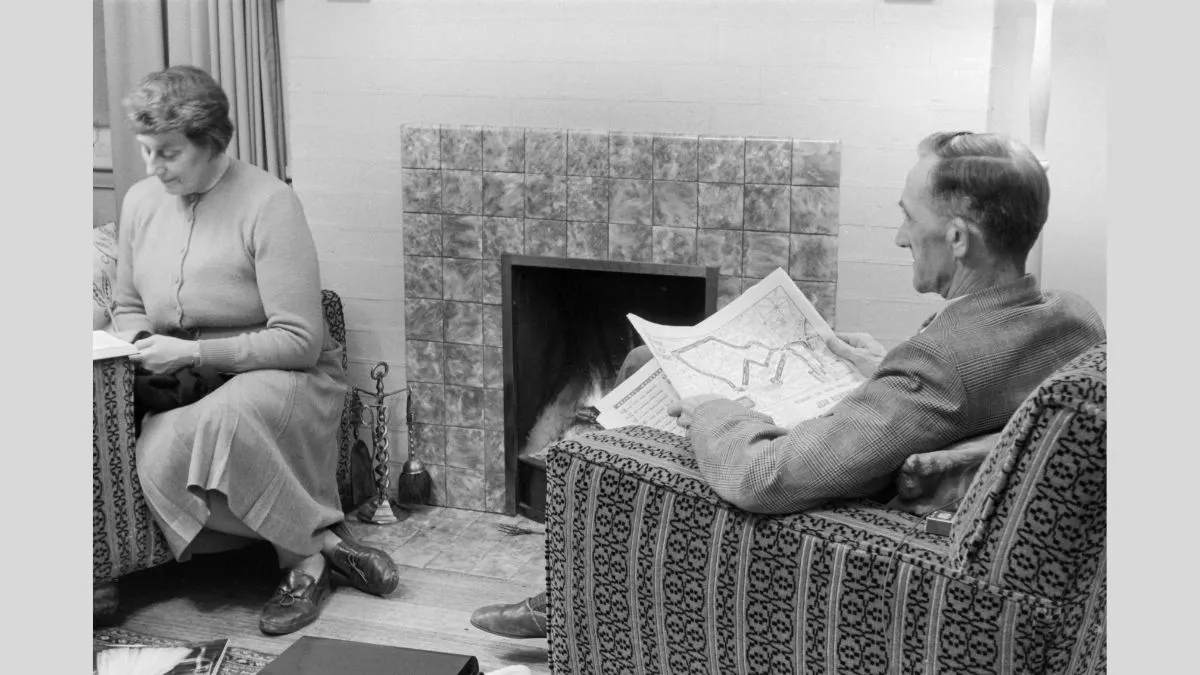 Artist statement: Taken in the lounge room at 12 Peverill Street, Deepdene. The couple are my mother (Elsie May Winters, aka Pat) and my step-father (Henry Firmin Winters, aka Hal). Typical evening situation - fire alight, both reading. Dad is reading The Herald, which can be seen to be open at the page showing the route of the Coronation procession in London.
