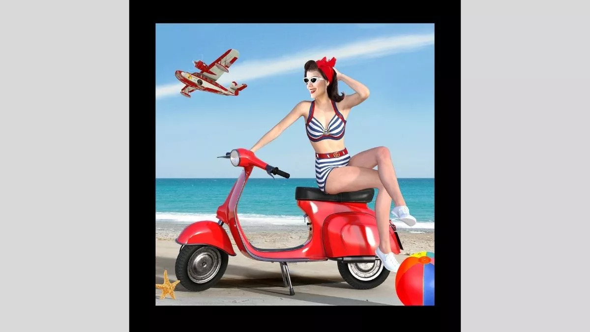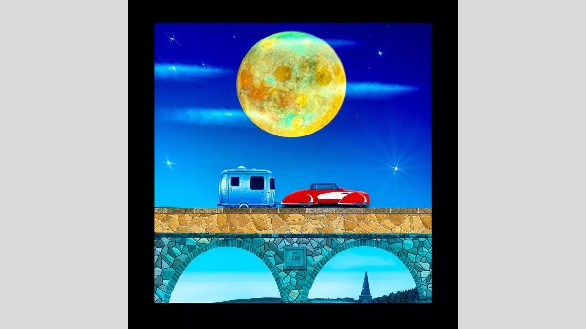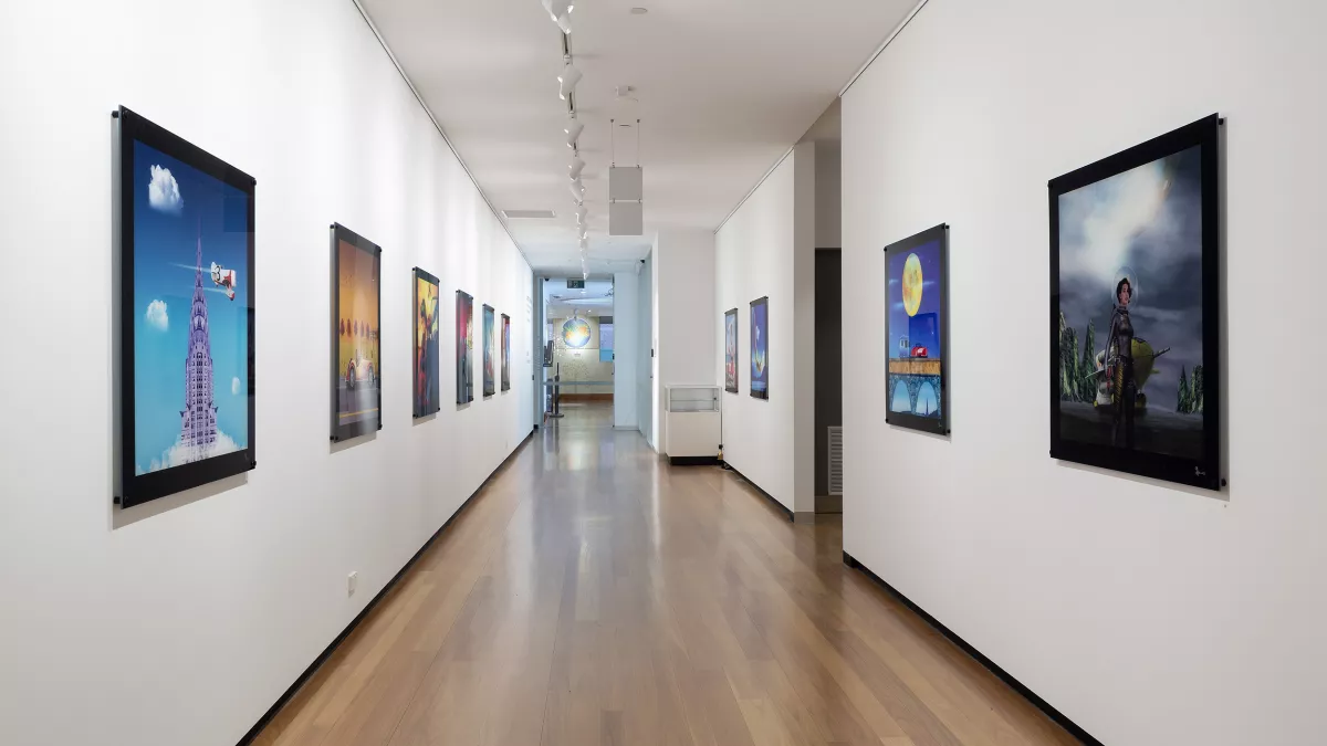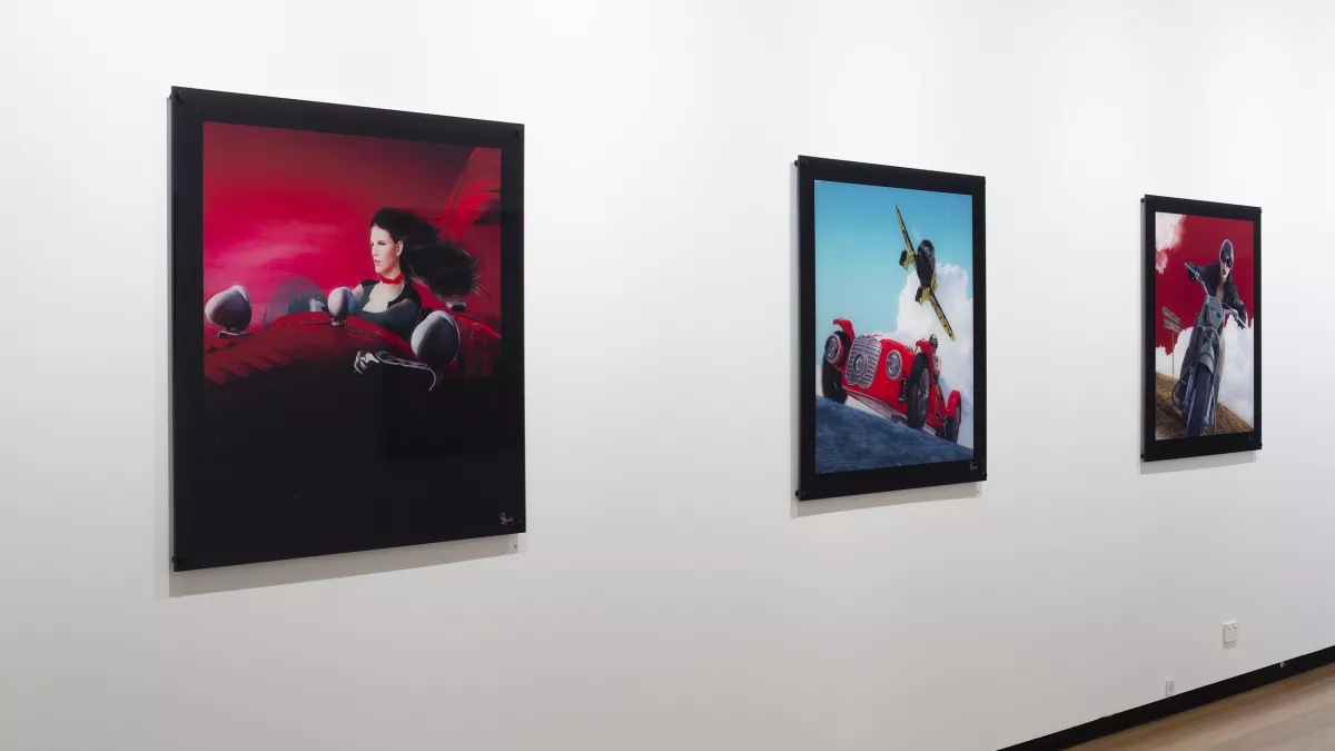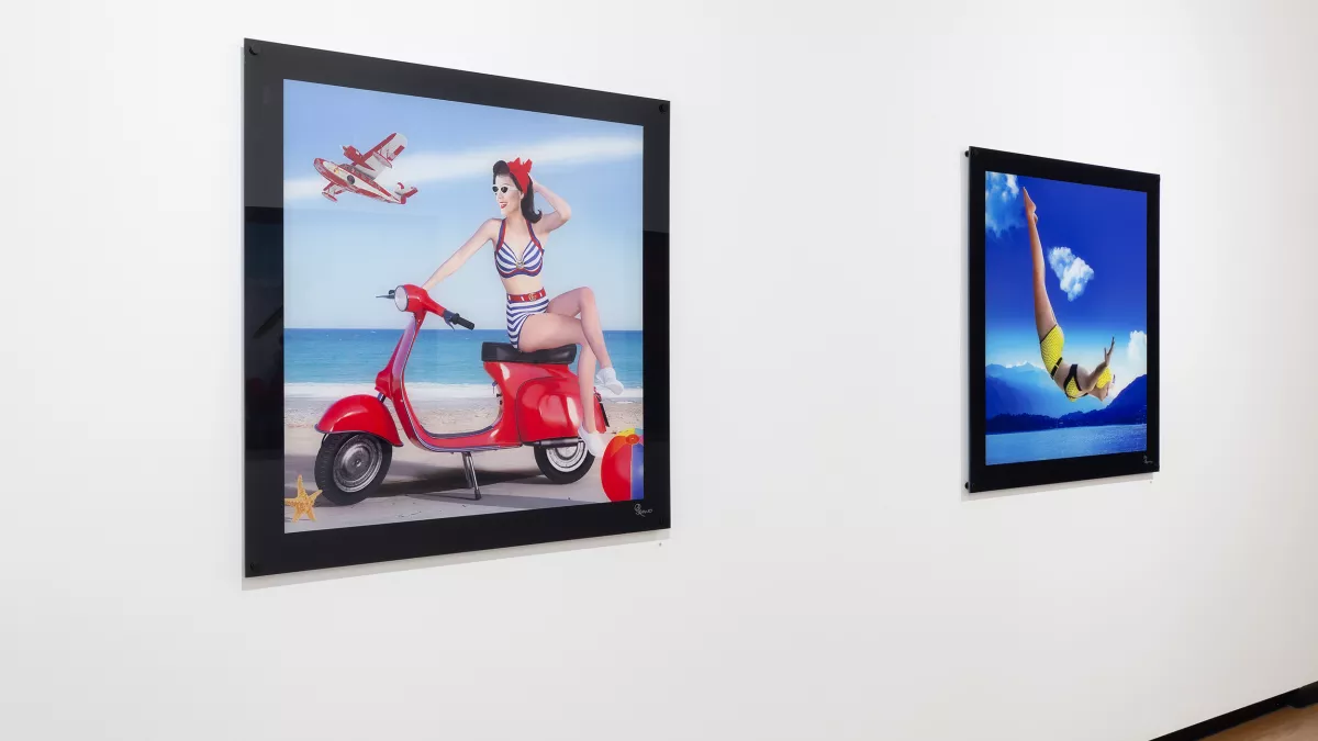 This series uses mixed media photography with digital printing and 3D modelling, lending the works a graphic quality reminiscent of the hand-coloured advertising and poster-art of the era.